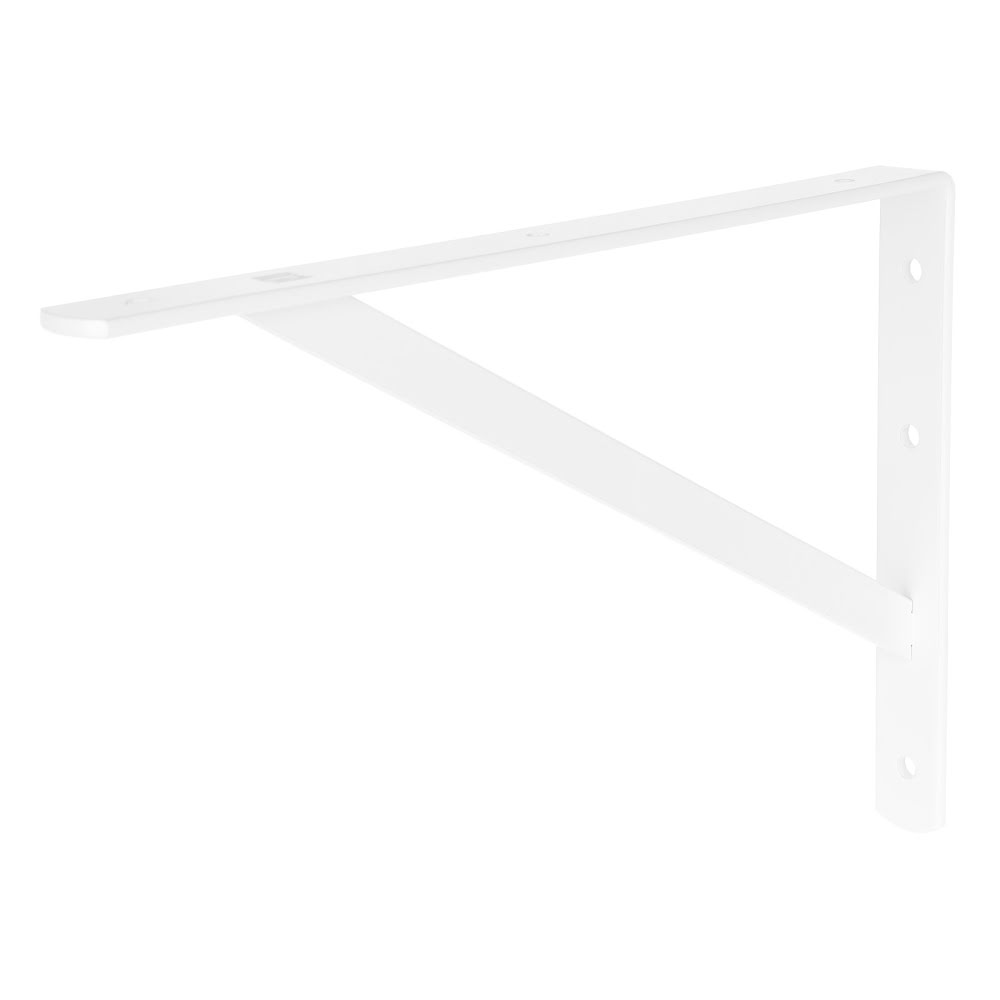 Metal shelf bracket for anchoring a shelf board to the wall. The load-bearing capacity of the bracket is reinforced with a brace. The bracket needs to be securely fastened to the wall using countersunk head screws (not included).